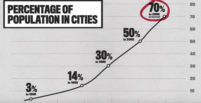 Boyson proposes the issue and questions how we will solve this difficult formula during the fastest growth pace of cities in history. He shows that 70% of the world’s population will reside in cities in the year 2050, climbing at unprecedented rates.