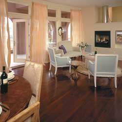 The entry to the C unit opens on a long hallway, rich with gleaming wood floors. To the immediate right is a formal room, which could be a living room or even an office. The designers chose to make this the music room, complete with baby-grand piano and haute couture drapes.