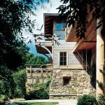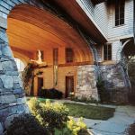 But as the scope of the project expanded, ultimately to 3,200 square feet, the intensity of design and the density of detailing remained at a level more commonly associated with small, boat-like buildings. Because the site lies in a coastal flood plain, and because its best views are at tree-top level, van Boer stacked functions in layers of ascending importance: utility and exercise spaces at ground level, guest areas at the second floor, living spaces and the owner’s private suite at the upper levels. The first two floors are housed in a pair of massive, stone-clad piers separated by a broad, arched tunnel through the building. The first pier holds the main entry, a garage, and a small laundry at ground level, with a two-bedroom guest suite above. Across the tunnel, accessible only via outside entries, are a small ground-level indoor pool and a second-floor guest apartment. Only the third floor spans the full length of the building.