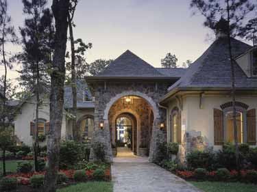 The epicenter of this European one-story home is an imposing great room with a central fireplace on a raised stone hearth. It is flanked by a U-shaped island kitchen and a breakfast nook. The home’s old world charm extends into the master suite, which features a sitting area, built-in bookshelves, a whirlpool tub, a separate shower, a dual-sink vanity, a compartmented toilet, and a walk-in closet. Two additional family bedrooms share a full bath. A three-car garage completes the plan.
