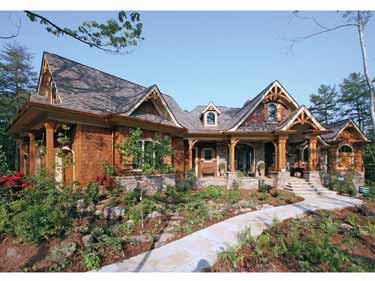 With its stately stone exteriors, this buttoned-down, one-story country manor would look at home in nearly any market, which may account for its popularity. An impressive, though not oversized, timber-framed entrance makes a strong first impression. It leads into a gallery flanked by a formal dining room and a great room with a window wall overlooking the rear patio. A huge master bedroom includes a sitting area and a walk-in closet that’s as large as the master bathroom. The gallery leads to a three-bedroom wing. The plan features an attached two-car garage, and a detached garage and workshop accessed through a covered breezeway.