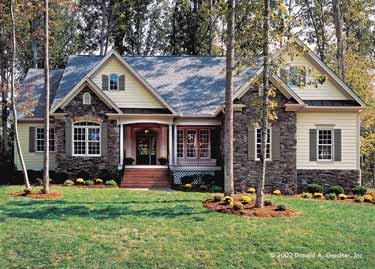 This classic one-story, great-room plan from Don Gardner packs a ton of living space into a mere 2,097 square feet. A Craftsman elevation with stone and wood siding provides rustic curb appeal. The home features an impressive view from the front door, through a vaulted great room, to a screened porch in the rear. Cathedral ceilings grace the great room, breakfast room, and study. Interior columns announce the great room, with a fireplace and surrounding built-ins. Two bedrooms share a full bath. The master bedroom includes two, full walk-in closets. The plan includes a breakfast nook, a study that could also serve as a fourth bedroom, and a formal dining room.