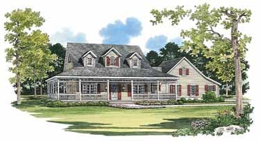 There’s a timeless appeal to this 2,090-square-foot farmhouse, with a porch that wraps all the way around the house. The garage almost looks like an attached barn. The classic rural elevation gives way to a modern floor plan, with a kitchen that flows into to a great room, and a large master bedroom wing complete with sitting area. A sun terrace and spa are located off the master bedroom. The formal dining room in this relatively open plan is defined by a low wall and by graceful archways set off by decorative columns. The kitchen includes a central island counter and a snack bar; it adjoins a laundry area.