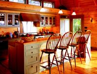 Shaker Style As hardworking as they are, islands are about more than function and socializing. They also can contribute to the style of a space. For this house overlooking Maryland’s Severn River, architect Jim Rill wanted the island to read as a piece of furniture and designed an elegant showpiece. The charcoal granite surface supported by reddish-brown mahogany legs provides a rich counterpoint to the room’s abundant glazing, vaulted ceiling, and walls of white painted siding. To accommodate the clients’ need for storage, recessed cabinets sit discreetly underneath the base, masked by the same V-groove siding found on the walls.