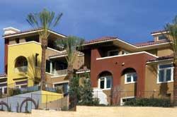 Looking up the hill at the townhomes that make up The New American Home 2003, they resemble an Italian hill town. This is a six-unit building, but the townhomes are flexible enough in plan to be grouped in a variety of configurations.