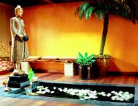 The owner wanted his prized Thai Buddha to be the focus of the space. A skylight backlights this peaceful icon, while a pond outlined in dark slate inlaid with brass gurgles gently at Buddha’s feet. The fountain’s mechanics are hidden in the statue’s base and the slate trim projects about 2 inches over the water for a seamless look. Willard jokes that the pond will last longer than the house. “The entry is about 5 feet above street level and the contractor had to build a wood structure up from the ground and encase it in concrete for support.” Builder: Structural FX, San Mateo, Calif.; Architect: Lawson Willard Architecture, San Francisco; Interior designer: Your Space, San Francisco; Photographer: David Duncan Livingston.