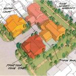 Woodley achieves double and triple density by creating micro-homes with side-access garages served by a shared motor court. On a typical lot, one house faces the street and front sidewalk; the house behind it faces the greenway sidewalk. Each pair of lots (four or six houses) is anchored by one stub lane, or motor court.