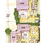 The reworked 6,000-square-foot plots follow the same playbook, though property lines shift to accommodate the green spine and, in the double-density version, a small park shared by eight houses. Less than 1,000 square feet, these homes nevertheless are designed to live large with volume spaces in front and glass walls opening to a courtyard.