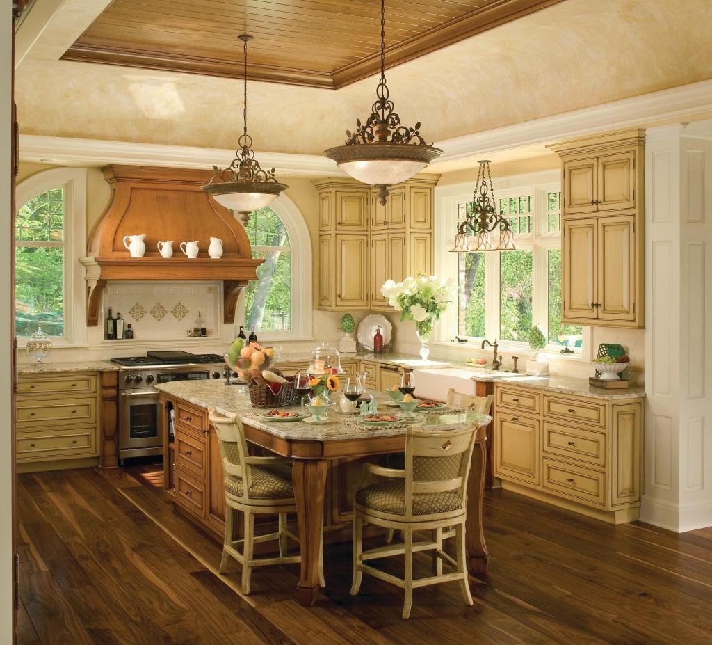 Earthy though its palette may be, this kitchen is more refined than rustic, thanks to furniture-style moldings and raised panel cabinet faces, upholstered chairs, antique pendant lights, and a graceful range hood with display shelving for china. A leaded-glass pocket door connects to an adjacent pantry.
