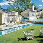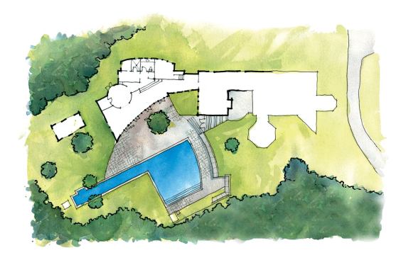One of the owners’ kids is a competitive swimmer, so they needed a pool that is actually two pools in one. Situated in the primary sightline of the main house and pool house is a conventional recreational swimming pool. Perpendicular to the “fun” pool is a regulation 25-meter-long racing pool. Foote worked with landscape architect Jennifer Jones to blend the racing lane smoothly into the scene. The lap lane crosses the top of the recreational pool and then extends into the woods. This sets up a terrace extension that trails the lap lane part way then fades to a point by following the curve of the pool house. The overall shape of the conjoined pools shadows that of the main house with its pool house appendage. A wooded path stretches from the pool to the tennis courts, guest house, and the original farmhouse, which was renovated for the owners’ parents. Foote’s goal was to allow everyone easy access to the pool and outdoor spaces without anyone being underfoot. The extra pool perimeter also eases congestion during the large gatherings that are frequently hosted outdoors.