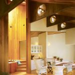 In the event of too many rays, Foote devised a trellised brisesoleil. Large openings in the sunscreen wall are aligned to focus breezes toward the glass doors lining the living/entertainment room.