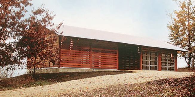 Utility buildings, those bit players on the architectural scene, are seldom the occasion for innovative work. This simple but elegant work building, on the grounds of a private vineyard, is a refreshing exception. Comprising two bays separated by an open dog-trot, the building houses two functions—vehicle storage and wine production. To provide natural light for both without the use of conventional windows, architect John Vetter developed a wall section that employs an extruded polycarbonate sheet over open cedar 2×4 framing. Cedar 6×6 columns at corners and at the half-bay points provide lateral rigidity, compensating for the lack of structural sheathing. Spaced, horizontal cedar 1x6s overlay the polycarbonate material, filtering the daylight and giving the building an intriguing combination of openness and shelter. Our judges noted the simplicity and apparent effectiveness of the flashing details and agreed that the design as a whole delivers both functionality and pleasing aesthetics with a remarkable economy of means.