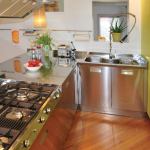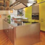 Papaya yellow lacquer cabinets make a hip and flavorful statement in the industrial-grade kitchen and are paired confidently with a stainless peninsula and suspended range hood. Organic counterbalances to these hard, flat planes are found in the existing diagonal white oak flooring, monumental scale potato artwork, and the home’s weathered exterior cedar cladding.