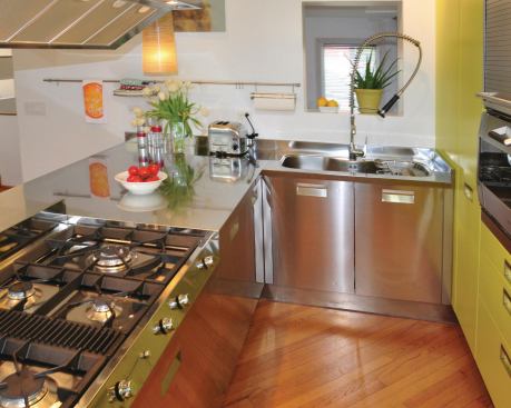 From the inside, the vibrant space feels invigorating and clean. From the outside, it creates a warm and softly welcoming light-box effect—particularly at night, when the kitchen appears to glow from within.