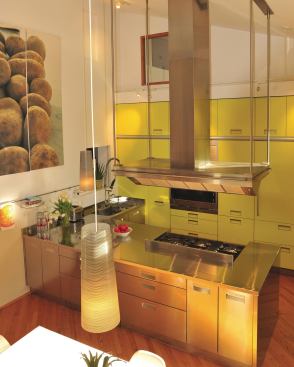 Papaya yellow lacquer cabinets make a hip and flavorful statement in the industrial-grade kitchen and are paired confidently with a stainless peninsula and suspended range hood. Organic counterbalances to these hard, flat planes are found in the existing diagonal white oak flooring, monumental scale potato artwork, and the home’s weathered exterior cedar cladding.