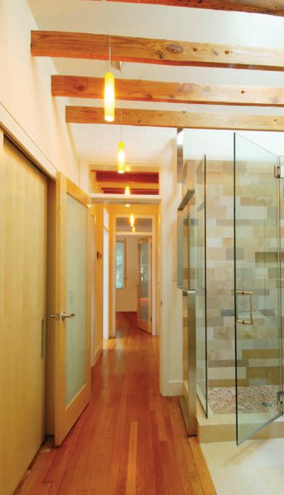 WORKING WITHIN tight limitations can yield spirited design, as this well-executed architectural maneuver proves. The program was simple: Renovate a bath on the top floor of a small row house and make its attic stair and attic space usable. The goal, says architect Todd Ray, was “to interweave all of the spaces to seem like pieces of a whole and extend the vertical spaces and connect them with light.”
