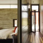 Working upward from the plan, the house builds layers of complexity in materials, geometry, light, and views. A 2-foot-thick rammed earth wall anchors the great room, screening views to the south, while a high glass wall opens toward the north. A canted butterfly roof—rising from south to north—floats above a high clerestory, reinforcing the orientation toward the mountains. The main house’s two bedroom wings, as well as the gym and guest house, shelter under separate and distinctly different roof forms. Favoring large expanses of glass over punched openings, Nave located the house’s few conventional windows to offer poetic, fragmentary views. “Anywhere you are in the house you have another vignette,” he says, “but nothing’s framed, so it’s more like being in the landscape than like taking pictures of the landscape.”