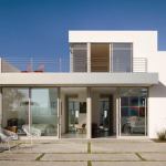 The two-and-a-half-story main house, built on the ocean side of the lot, contains the major living spaces, including a single bedroom with a balcony facing the sea, a study, a wine tasting room in the basement, and a roof-top deck with a full kitchen. A stairwell on the back became a vertical gallery for the owners’ art and collections from their travels.