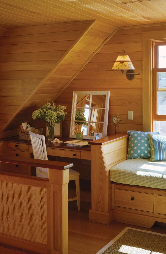 Why add another bedroom to an already packed program when it’s only going to be used a few days per year? That’s the reasoning architect Mark Hutker used with the owners of this new house on Martha’s Vineyard. In lieu of that extra bedroom, the stair landing was deepened and outfitted with a multitasking built-in: a window seat/guest bed. It features a sloping headboard that Hutker says makes the spot comfortable for all uses. The headboard connects the seat to a small desk with file storage. Hutker credits his general contractor and lead carpenter, Leo DeSorcy, for making the complicated design look simple. Every measurement had to be exact to make the space functional for varied activities in less than 100 square feet. Even the fact that the owners are right-handed factored into the plan. The carefully detailed design is rendered in lively yet warm cypress, while slabs of contrasting mahogany top off the desk and the seat’s headboard/armrest. Materials were chosen to ensure they age gracefully when exposed to sea air. “The V-grooves in the cypress planks let the wood expand and contract over seasons,” Hutker says, “and solid bronze hardware will reflect its use over time.”