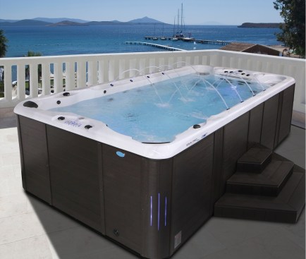 The Swim Pro F-1325 Fitness Swim Spa functions as both a resistance swimming training system and a place to rest and relax. Bottom-mounted jets create a resistance current along the length of the tub, which may be adjusted to match the swimmer’s speed and ability. The tub body incorporates a set of fitness anchors and tether anchors, as well as a floor-mounted swim lane marker. The tub seats up to 11 people on bench-style seating, and incorporates 23 stainless-steel, candy cane-style jets placed to target users’ pressure points. The tub’s heating system is powered by a 5.5kW titanium heater. calspas.com