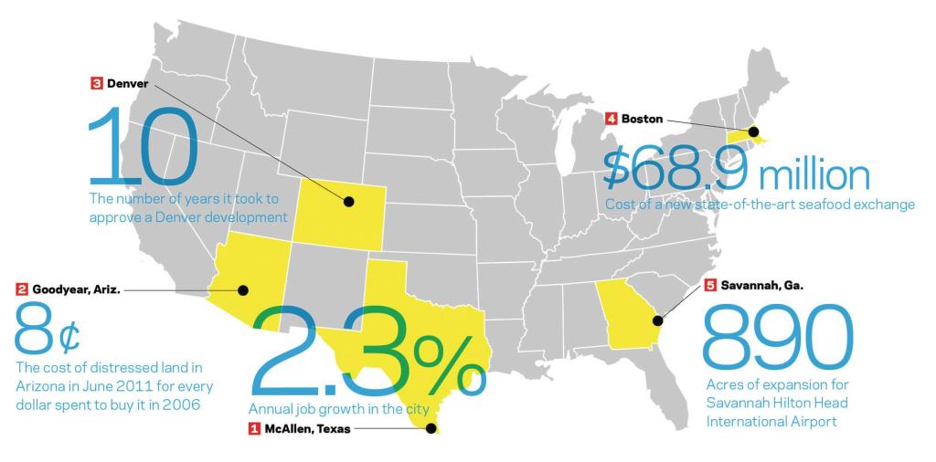 1) McAllen, Texas, leads Hanley Wood Market Intelligence’s list of top 75 markets for job growth. Driven by business expansion related to cross-border commerce, the town’s job numbers rose 2.3 percent annually in the first quarter of 2011. In May, job growth around the country was the weakest since September, Market Intelligence says.