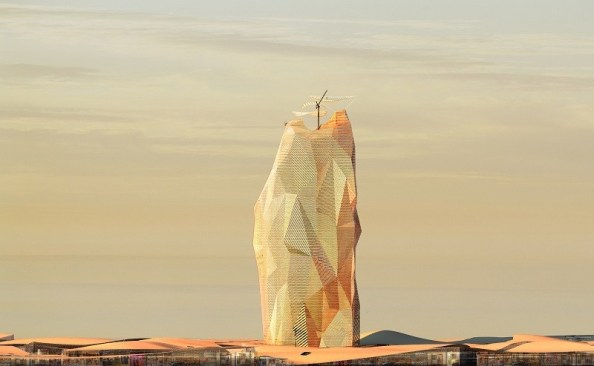 The 1,450-foot tall tower, designed by French architectural firms OXO Architectes and Nicolas Laisné Associés, will power itself in the Sahara desert. The rock-like 8.4 million-square-foot building would house offices, 600 residences, a hotel, shopping center, sport facilities, a panoramic restaurant and bar, a spa, a museum and an observatory. An inner-tower covered in vegetation will act as a vertical farm for food sustainability.