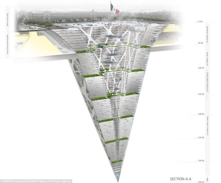 This 65-story building won’t go up, but down. The upside-down pyramid-shaped “earth-scraper” will plunge almost 1,000 feet into the ground. The city will be able to fit 300,000 people and will feature housing, retail, 10 floors of office space. An 800-square-foot glass roof will allow natural sunlight to flow in.