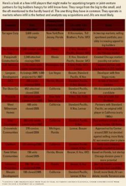 Jody Kahn Kline, senior market analyst at Michael P. Kahn and Associates, has worked with two potential buyers interested in infill during the past 12 months. “The jury is still out” on the deals, she says. Many of these companies operate under the radar, and don’t show up on lists such as the Builder 200, Kline observes. (For a listing of a few acquisition candidates, see “The Apple of Their Eyes,” page 30.)