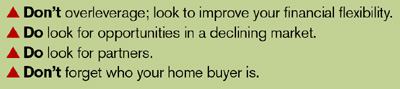 As the market stabilizes downward, builders need discipline. Appreciation no longer obscures bad land moves. Opportunities will present themselves, but the key is to have the financial flexibility to take advantage of them and to consider joint ventures. And above all, know your own market.