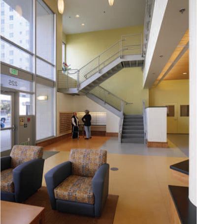 THIS MIXED-USE PROJECT provides affordable housing for seniors in a new neighborhood adjacent to San Francisco’s South of Market area. It is the first building in the country to allot a specific percentage of the residential units for seniors living with AIDS, says architect Tom Brutting. The vibrant building also houses a community center, retail space, a public library branch, and a day health center. This combination of spaces helps foster intergenerational interaction that has been shown to enhance seniors’ lives.