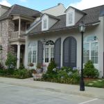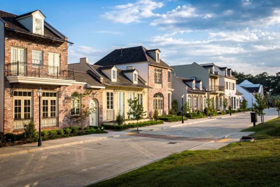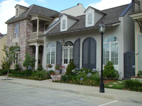 Front porches and balconies provide semi-private outdoor areas while large public greens complete the outdoor living options. Several oaks were preserved during construction and the site plan focuses on those stately trees—using them to generate a grand entrance and shaded park. Three live/work dwellings soon will be built among those oaks, facing the street that bypasses Perkins Lane. Adding this mixed-use component makes sense given the pastiche of neighbors. Residential communities flank the 4-acre infill development, retail centers line the opposite side of the street, and Louisiana State University is a short scenic bike ride away.