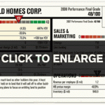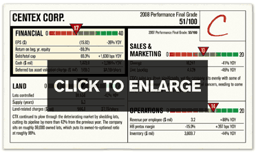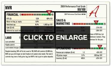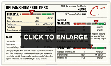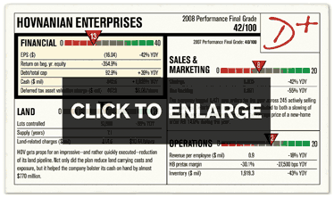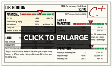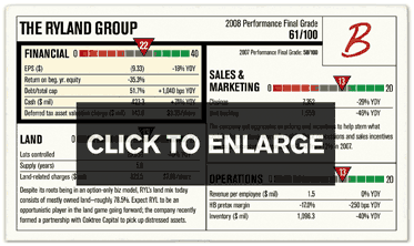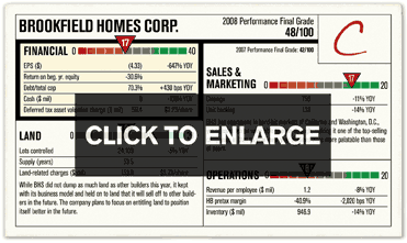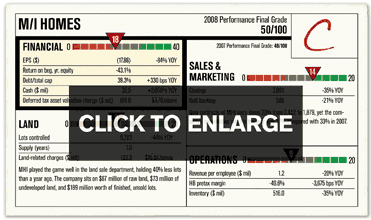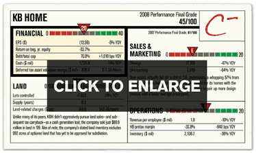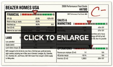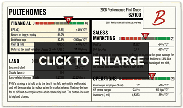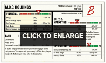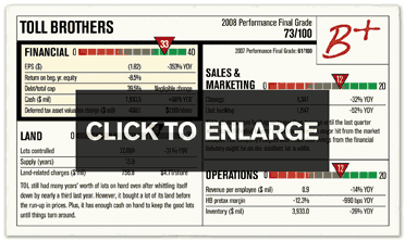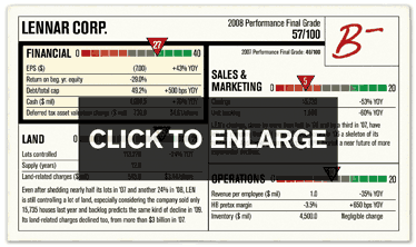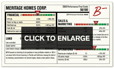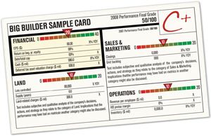 Report Card Methodology: An annual data presentation that combines original and researched information with proprietary analysis, the BIG BUILDER Public Builder Report Card uses key financial and operational reports available through investor presentations and Securities and Exchange Commission filings. In addition, we incorporate feedback from investor relations and senior financial officers, reconciling fiscal year results with our reporting period to provide a more comparable representation of activity during the 2008 calendar year. This year, our home builder universe includes 16 companies traded on the U.S. stock exchange whose primary business is that of building homes. The evaluation breaks quantitative data into four categories: financial, land, sales and marketing, and operations. Because a public company’s overall performance is so closely tied to financials, we weight this category more heavily. The report’s structure was developed by BIG BUILDER in conjunction with former analyst Barbara Allen.