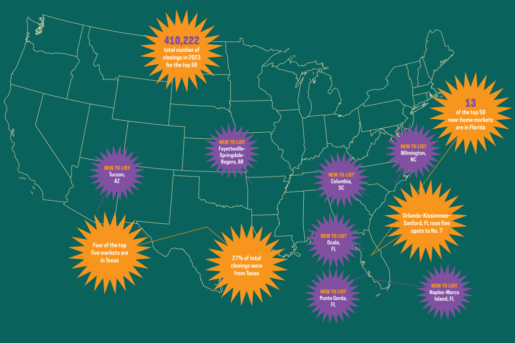 This year’s list, ranking the nation’s 50 largest new-home markets by closings in 2023, includes eight markets from Texas, Florida, and North Carolina in the top 10.
