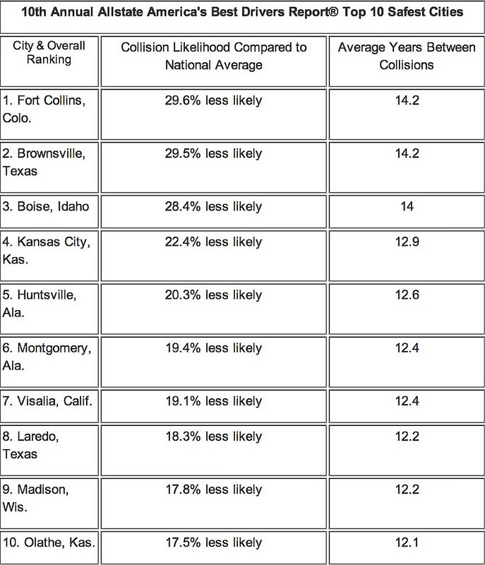 Allstate Insurance Company today released its tenth annual “Allstate America’s Best Drivers Report®.” The report, based on Allstate claims data, ranks America’s 200 largest citiesi in terms of car collision frequency to identify which cities have the safest drivers.