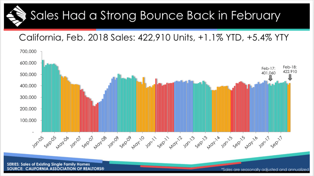 Closed escrow sales of existing, single-family detached homes in California totaled a seasonally adjusted annualized rate of 422,910 units in February, according to information collected by C.A.R. from more than 90 local REALTOR®associations and MLSs statewide.