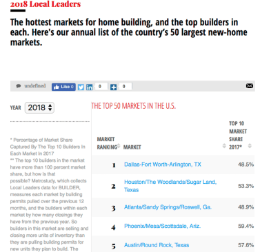 Nowhere is it clearer than our own 2018 Local Leaders ranking of home building’s 50 most-active markets in the United States, the importance of market penetration, not only for profits today, but for the ability to stay alive and prosper tomorrow. Our Local Leaders franchise showcases the top 10 builders in those top 50 markets by 2017 volume, where concentration and local scale are already playing out in profitability, business model strategy, and mergers and acquisitions jockeying for footprint adjustment, leverage, and advantage for the coming several years, and leading into what many believe will be a cyclical downturn in the next two to four years.