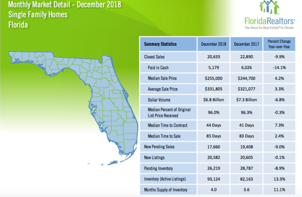 Sales of single-family homes in Florida totaled 20,633 last month, down 9.9% compared to December 2017, the Florida Realtors reported Tuesday.