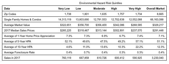 ATTOM Data Solutions today released its 2017 Environmental Hazards Housing Risk Index, which shows that median home prices in U.S. zip codes in the highest 20% for environmental hazard risk appreciated at a faster pace than the overall U.S housing market over the past year, past five years and past 10 years.