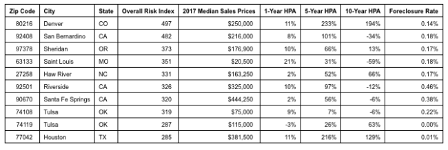 Zip codes with the 10 highest total Environmental Hazard Housing Risk Index values in 2017 were in Denver, Southern California, Portland, St. Louis, Burlington, North Carolina, Tulsa, Oklahoma and Houston.