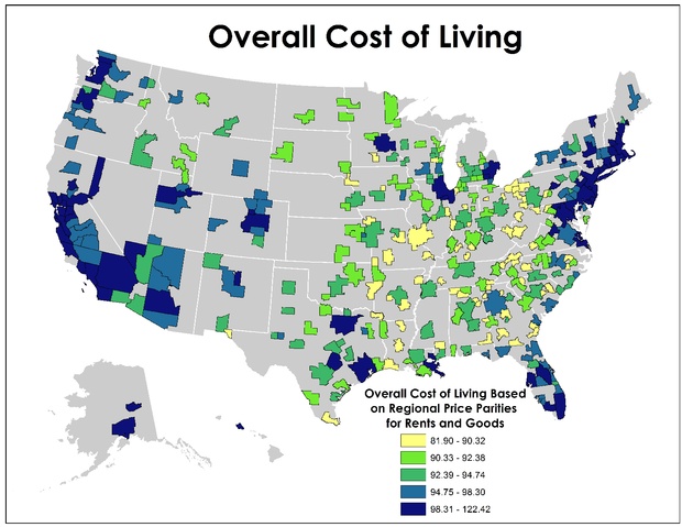 CityLab demographics jefe Richard Florida teams up with colleague José Lobo of Arizona State University to calculate average regional price paraties for 2008-2012 for four different categories: overall cost of living, cost of living for rent, cost of living for goods, and other.