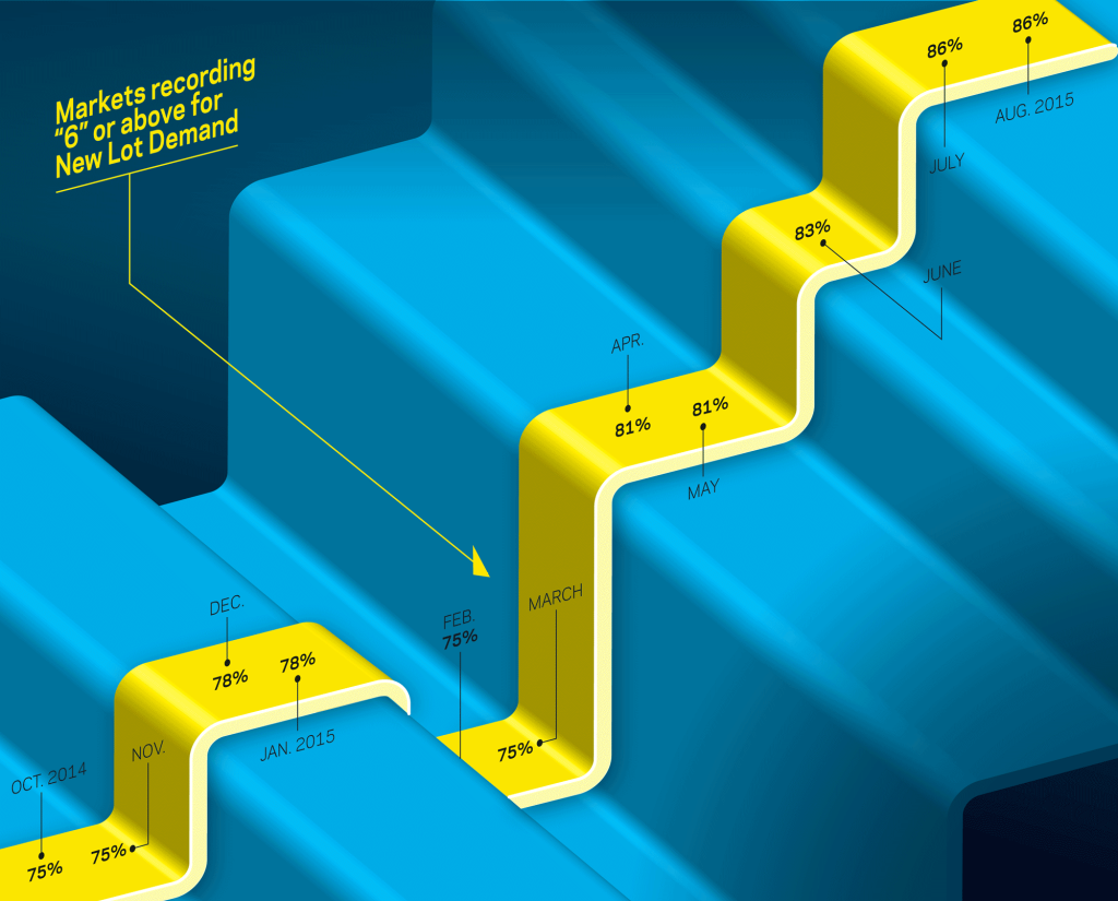 We see this reflected by the number of markets with lot demand scores in the upper range of the scale (6-10) from April to June; 80% of regional directors in 36 markets scored demand for new lots at a 6 or above in the second quarter, compared with 77% in the first quarter. However, the increase reflects a positive or negative climate, depending on the market. In markets like Naples-Fort Myers and San Diego, high scores represent a healthy equilibrium between starts and deliveries, or healthy future supply.