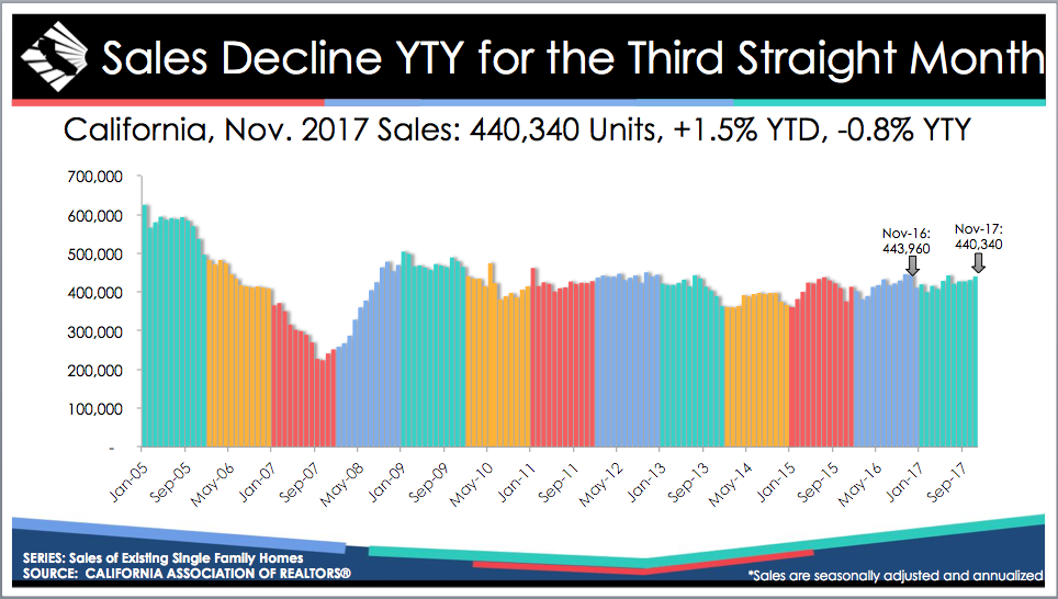 Closed escrow sales of existing, single-family detached homes in California totaled a seasonally adjusted annualized rate of 440,340 units in November, according to information collected by C.A.R. from more than 90 local REALTOR®associations and MLSs statewide. The statewide sales figure represents what would be the total number of homes sold during 2017 if sales maintained the November pace throughout the year. It is adjusted to account for seasonal factors that typically influence home sales.