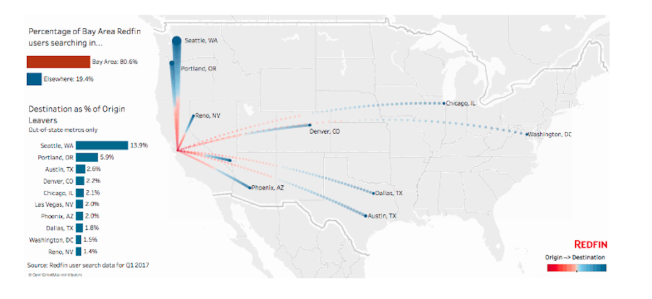 In an analysis of a sample of nearly one million Redfin.com users searching for homes across 75 metro areas in the first three months of 2017, we found that one in five (19.8%) searched mostly1 for homes outside their home metro2. Among them, about half searched exclusively in other metros. Three trends dominated the migration patterns seen in Redfin.com user searches last quarter: