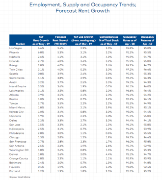 Although the “bullish outcomes” of that six-year period might not be sustained in 2019, “most markets continue to be in good shape, with only a handful producing rent growth of less than 1.5% year-over-year,” says the report, which is based on a survey of 127 major U.S. real estate markets.