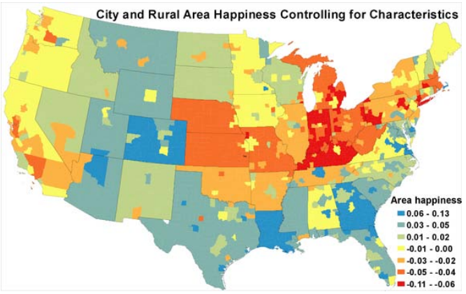 Priceonomics’ Alex Mayyasi posts on happiness in America, mapped in the research of Edward L. Glaeser, Joshua D. Gottlieb, and Oren Ziv for the National Bureau of Economic Research in their working paper titled “Unhappy Cities.”