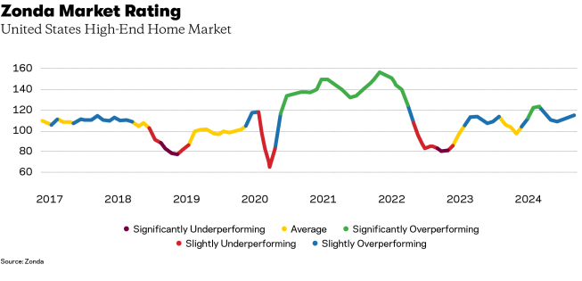 This affluent crowd is ready for another year of luxury even as the market challenges and affordability constraints of 2024 hang around. Our national Zonda Market Ranking (ZMR), which adjusts sales for supply and seasonality, revealed that the high-end market overperformed for the whole of 2024, which is why weâve chosen to name some top markets to watch for high-end buyers this year.