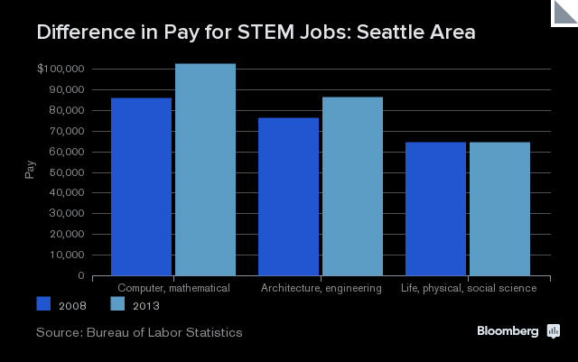 Bloomberg Rankings examined U.S. metros with at least 100,000 professionals working in science, technology, engineering and mathematics, also known as STEM. It looked at their pay since 2008 and came up with the list below of the places with the biggest increases, based on the latest available data.