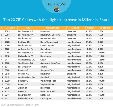 To find out, apartment-search firm RENTCafé analyzed U.S. Census data to find where millennials live and their next potential hot spots. The company then ranked ZIP codes in the 30 biggest U.S. cities by three measures: (1) highest increases in millennial population from 2011 to 2016; (2) largest current share of millennials; and (3) highest current population of millennials.