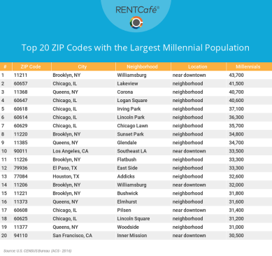 Population-wise, areas surrounding New York City make up nine of the top 20 of those with the largest millennial populations, but none is in Manhattan. From Williamsburg in Brooklyn to Corona in Queens, over 40,000 millennials call these ZIP codes home. ZIP code 11211, in Williamsburg, houses 43,700 millennials, the largest amount in the U.S.