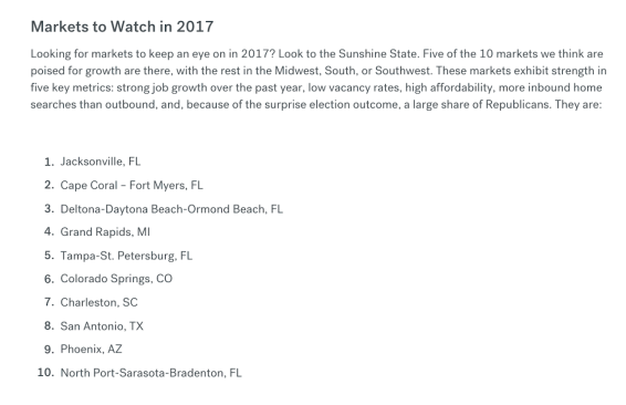 Trulia chief economist Ralph McLaughlin counts five metrics as key indicators characteristic of anticipated extra growth in 2017: strong job growth year to year vs. 2015, low vacancy rates, high affordability, more inbound than outbound home searches on Trulia’s mega search engines, and, perhaps a bit oddly, a larger share of Republicans. Check out his column here to see how he came up with this list of “markets to watch in 2017.”